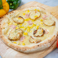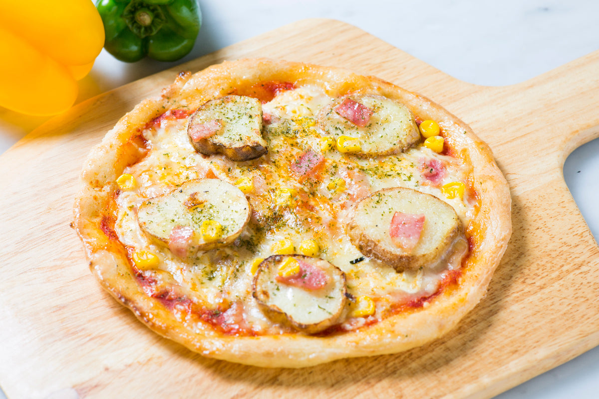 メインには、ホクホクとした食感がたまらないスライスポテトを贅沢にトッピング。そこに、じゃがいもの旨みを引き立てるようにマヨネーズソースを加え、ベーコン、玉ねぎ、コーンの黄金トリオが脇を固めます。マヨネーズの主張を抑えることで、トマトソースとナチュラルチーズの味わい、そしてじゃがいも本来の甘みが際立つ、バランスの取れた優しい味わいに仕上げました。